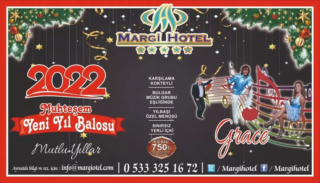 Margi Hotel 2022 Muhteşem Yeni Yıl Balosu Margi Hotel 16 Aralık 2021 Etkinlikler, Haberler Margi Hotel Balo Salonunda 31 Aralık Gecesi eşsiz lezzetler ve müzik eşiliğinde gerçekleşecek yeni yılı karşıladığımız Yeni Yıl Balomuzda sizleri de aramızda görmekten mutluluk duyarız. Yeni yılı bizle birlikte geçirmek için bize ulaşın 0533 325 16 72 Share
